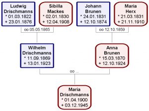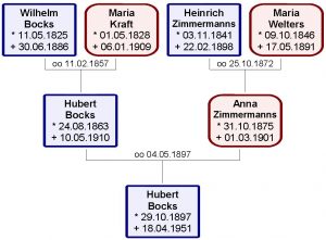 Die 4. Vorfahrensgeneration ist die letzte der familiären Überlieferung, zu der ich in den zuvor genannten Kirchenbüchern keine entsprechenden Einträge finde. Lediglich zu Heinrich Hubert Zimmermans (mit einem n) gibt es einen Eintrag aus Gerderath.